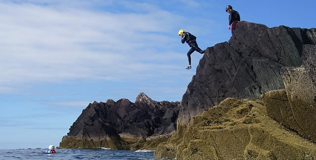 coasteering_jump A cloudy day on Anglesey at low tide jumping into the sea whilst coasteering. Adventure activities.