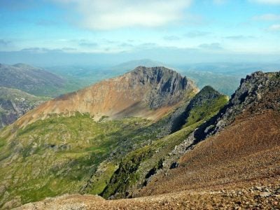 Mountains of Snowdonia to walk up. Blue skies and the orange ridge of Crib Goch next to Snowdon pictured.